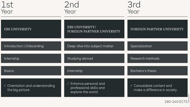 You start your six semesters with a two-week Onboarding Project. In your second year, you will spend at least one semester at one of our partner universities abroad. If you choose the dual degree option, you study for three semesters at EBS and three at a partner university. During the summer months, internships are planned, optionally also abroad. We offer language courses (incl. country specifics and culture) in preparation for your time abroad. In the fifth semester, you will choose one of six specialisations to sharpen your professional profile and prepare yourself optimally for your future career. In the sixth semester, you will write your thesis.